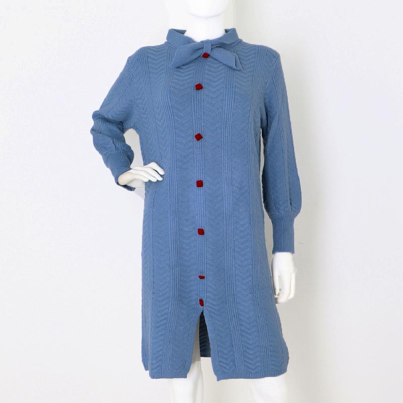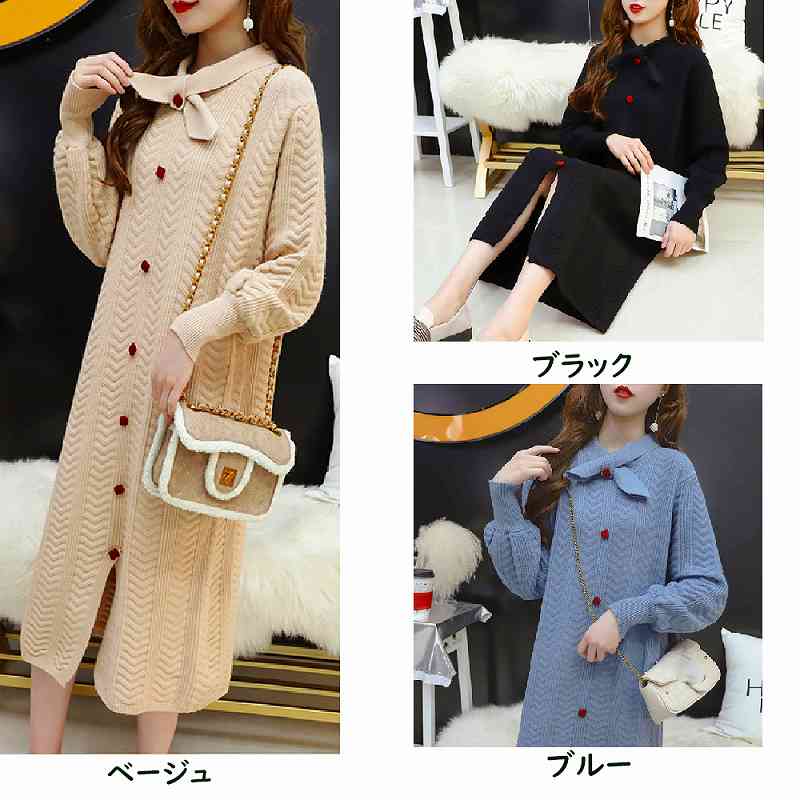 サイズ・容量ゆったりシルエットで着心地抜群なロングニットワンピース裾に入ったスリットとキュッと締まったスリーブのデザインがラインをきれいに見せてくれるので、マタニティーウェアにもおすすめですシンプルながら、首元に施されたリボンデザインとボタンの配色がポイントカラー:ベージュ/ブラック/ブルー素材:ポリエステル75%+アクリル25% サイズ:ワンサイズ総丈:約98cm 肩幅:約40cm 袖丈:約48cm ゆき:約68cm 身幅:約50cm 胸囲:約100-120cm